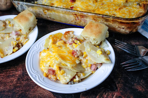 • Mix soup, milk, corn, salt, pepper, ham, cheese, and onion.Step 2Mix cream of mushroom soup, evaporated milk, corn, salt, pepper, ham, 1 1/2 cups of cheese, and onions if using.
