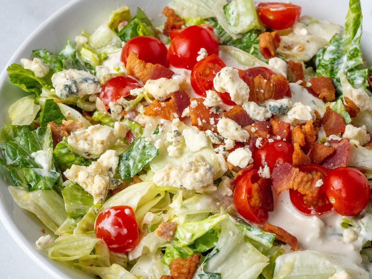 Toss the lettuce with dressing just before serving to prevent the leaves from wilting due to osmotic pressure from the salt. Layer the bacon and cheese crumbles on top last to ensure the bacon remains crunchy. Serve on chilled plates for the best experience.