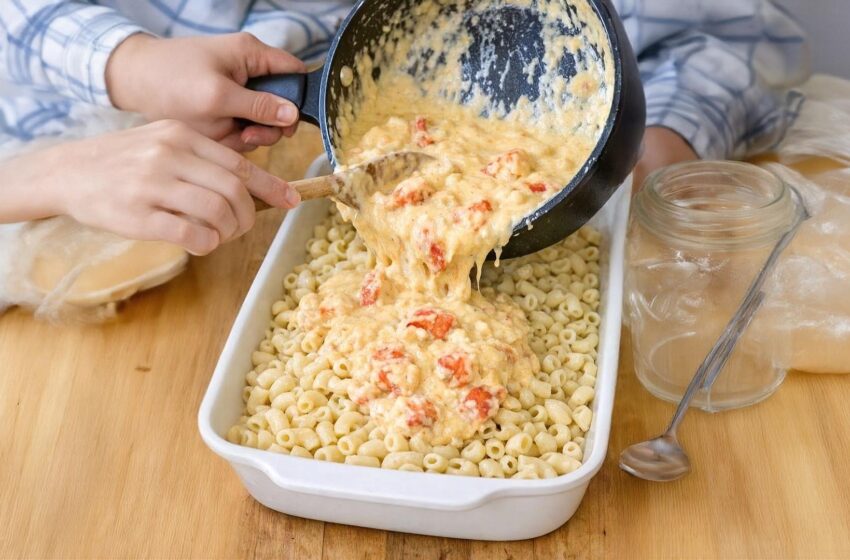 💡 Crucial Step: Carefully pour this hot lobster-cheese mixture evenly over the cooked pasta in your baking dish. Use a spatula to gently nudge the sauce down between the noodles so everything is coated, but do not aggressively over-stir!