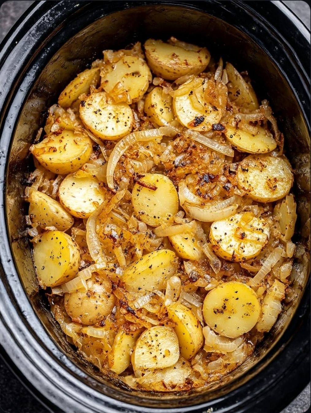 Once the potatoes are fork-tender and the onions have turned a translucent, golden hue, turn off the slow cooker. Let the dish sit for about 10 minutes with the lid slightly ajar; this allows the starches to settle and the liquid to thicken into a light, buttery glaze.