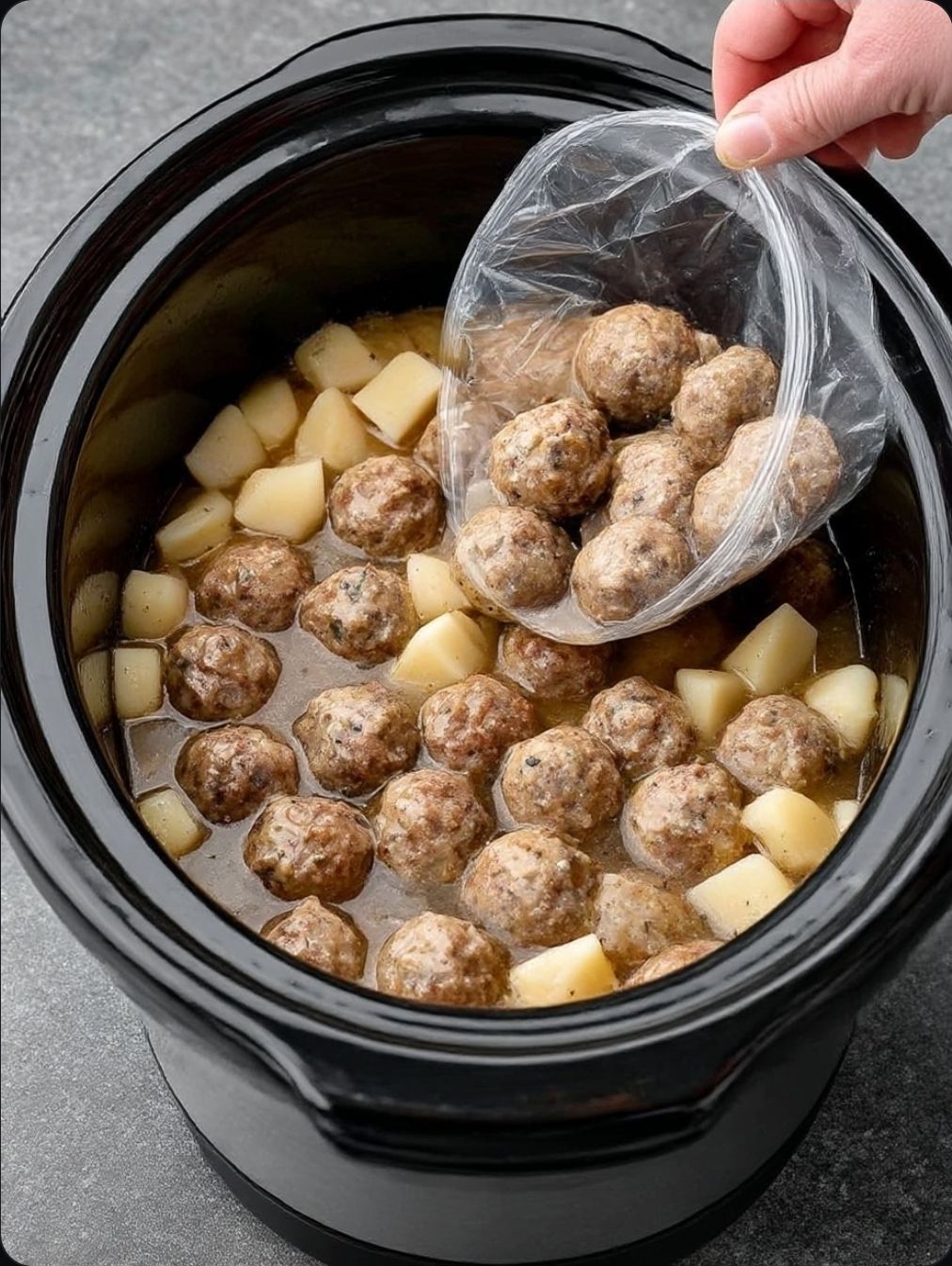 Pour the frozen meatballs and the frozen mixed vegetables over the potatoes. There is no need to thaw them beforehand; the slow cooker handles that transition perfectly.
