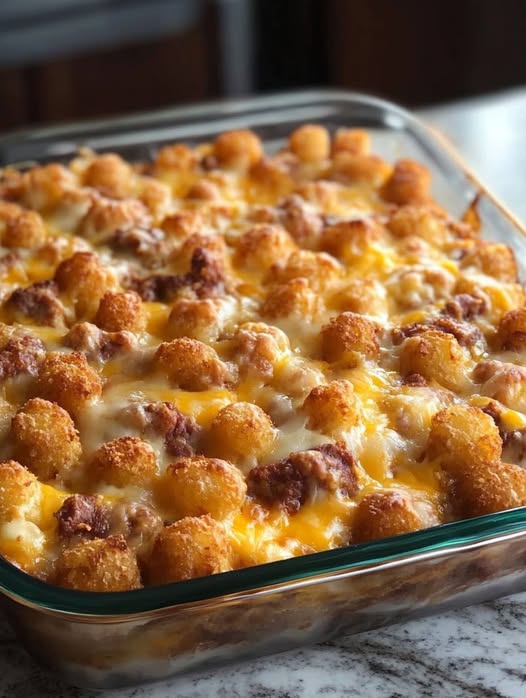 • Bake for 40–45 minutes. The casserole is done when the eggs are set (no jiggle in the center) and the tots are a deep, crispy brown.